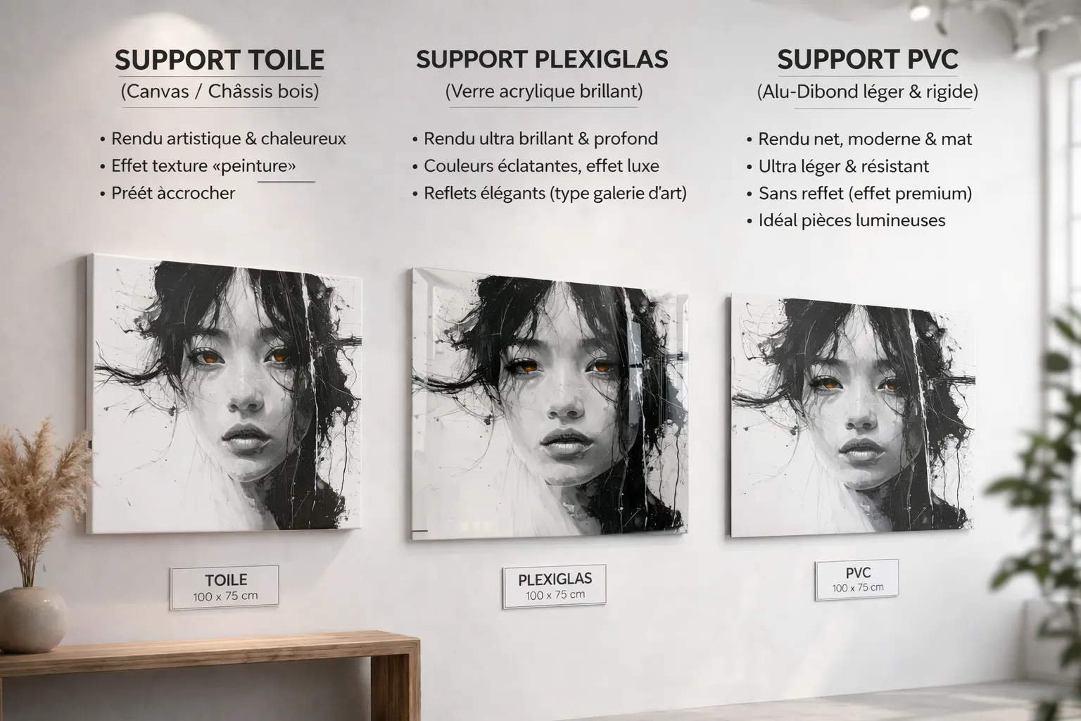 La toile offre un rendu artistique, le plexiglas un effet brillant premium, le PVC un rendu moderne mat.