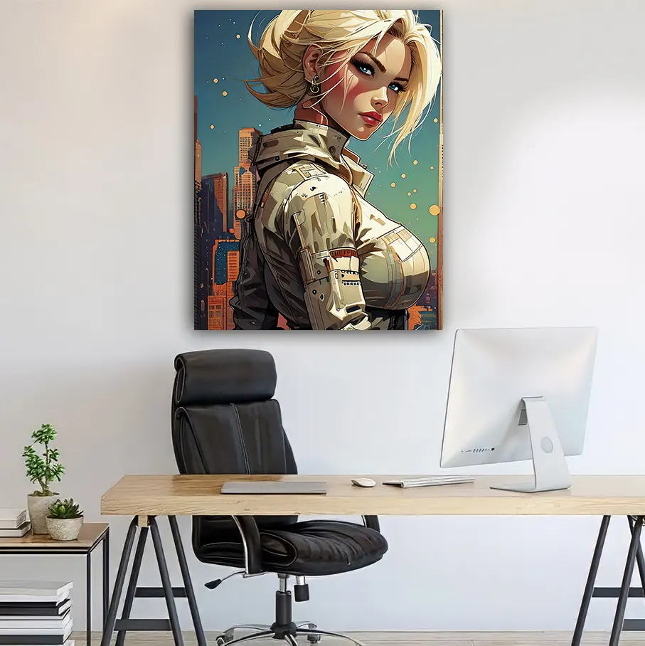 Le tableau femme futuriste cyberpunk incarne une vision artistique moderne où l’élégance féminine rencontre l’univers urbain et technologique. Ce portrait captivant met en scène une femme au regard intense, symbole de puissance, de confiance et de modernité.